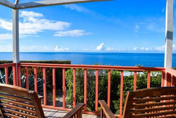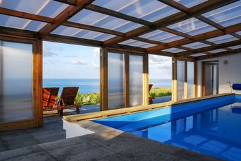 Im Garten befindet sich ein überdachter Swimmingpool mit herrlicher Aussicht auf das Meer.