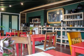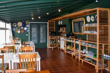Im Wintergarten des Nebenhauses wird das Frühstück mit hauseigenen Produkten aus biologischem Anbau serviert, einige davon werden auch zum Kauf angeboten.