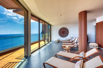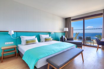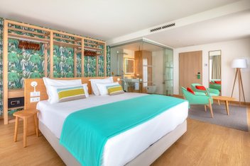 Die 77 Doppelzimmer und Suiten verteilen sich über vier Etagen. Die Gästezimmer haben entweder Gartenblick, seitlichen oder direkten Meerblick und sind ca. 25-39 m² groß. Alle Zimmer sind mit Balkon, offen gestaltetem Bad (inkl. Föhn), Klimaanlage, Minibar, Mietsafe, Kaffee-/Teezubereiter und Smart-TV ausgestattet. Die Suiten bieten Meerblick und sind 42-62 m² groß. Zudem haben sie einen abgetrennten Wohnbereich und sind nach unterschiedlichen Themen eingerichtet.